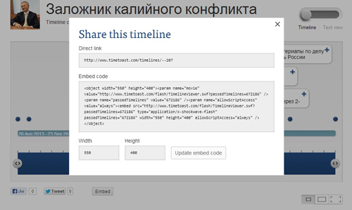 Теперь хроника опубликована на сайте Timetoast, и ее код можно вставить на свой сайт. С помощью кнопки Actions можно также отредактировать или удалить хронику.