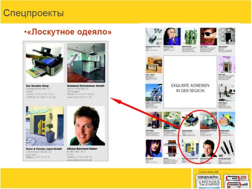 ДЛЯ НЕБОЛЬШОГО КЛИЕНТА подойдет другой спецпроект, я его называю «Лоскутное одеяло». Суть проекта — собираем небольших клиентов в одном проекте, с общим дизайном и находим какую-то общую «фишку» для привлечения к этой полосе внимания читателя. Например – акцент в центре полосы в виде пустого пространства с надписью «Лучше адреса города» – а вокруг расположена информация от клиента – название фирмы, род деятельности и контакты. В работе над этим проектом также важна предварительная работа и время для предварительной продажи.