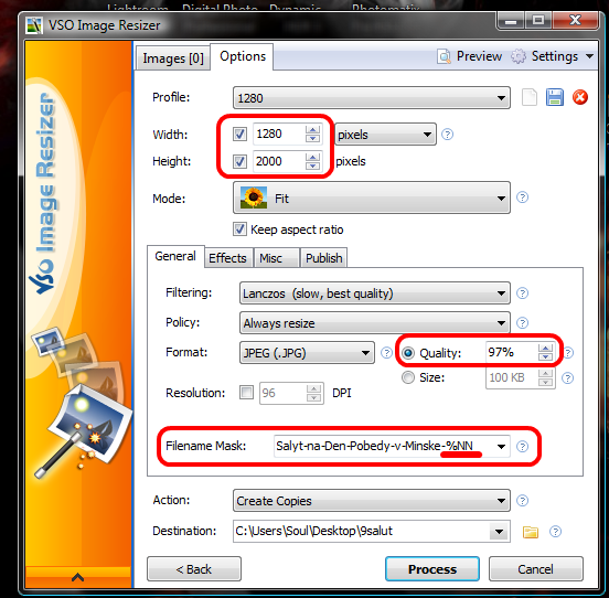 После того, как обработаете свои снимки, нередко встает вопрос еще и о уменьшении фотографий до требуемого размера, а также выставлении логотипа или водяного знака в автоматическом режиме. Существует программа Light Image Resizer, которую можно бесплатно скачать здесь. Она позволяет задавать всем фотографиям размер, который фото должны иметь на выходе, давать типичное имя файлам (для одного репортажа одно общее имя фото, где имя различается только на одну цифру от предыдущих — порядковый номер).