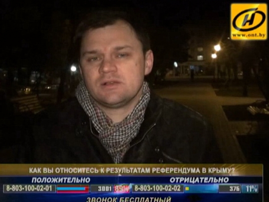 Самая ж фішка, што на дзяржаўным тэлебачанні мне (з іміджам апазіцыянера ў вачах праўладнай публікі) давялося быць адным з лічаных дзяржаўнікаў і дэ-факта абараняць пазіцыю беларускага МЗС наконт тэрытарыяльнай цэласнасці Украіны — абараняць у атмасферы імперскага шалу! Дык хто ў нас пятая калона, спадарства?