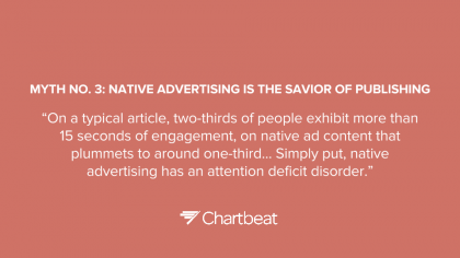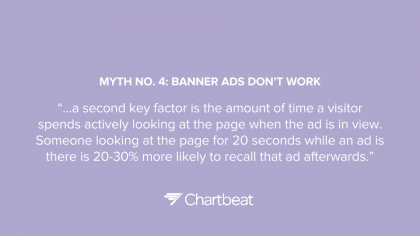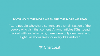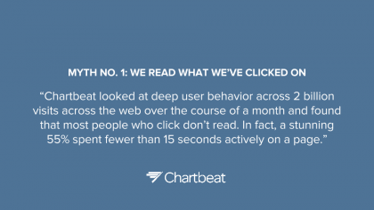 В материале, недавно опубликованном на Time.com, генеральный директор компании Chartbeat Тони Хайле развенчал четыре мифа о работе в Интернете. Он отметил, что количество кликов на статью совсем не обозначает, что статья была столько же раз прочитана; что не существует связи между обменом в социальных сетях и уровнем вовлеченности; что естественной рекламе недостает внимания пользователей и что стереотипы о том, как и где следует размещать рекламу, абсолютно неверны.