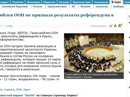 “Генасамблея ААН не прызнала вынікі рэферэндуму ў Крыме” — паведаміла ўвечары 27 сакавіка БЕЛТА. У тэксце даецца ўся арыфметыка. Чытач даведаецца, што за дакумент, скіраваны супраць расійскай анексіі паўвострава, прагаласавала сто краін, устрымалася 58, супраць выказалася 11. Нестае “дробязі”: як прагаласавала Беларусь.