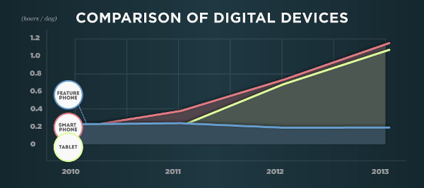 Как мы уже убедились, люди стали проводить больше времени в цифровых медиаканалах, особенно используя мобильные гаджеты любых типов. Но каковы цифры по типам устройств? Давайте взглянем подробнее.