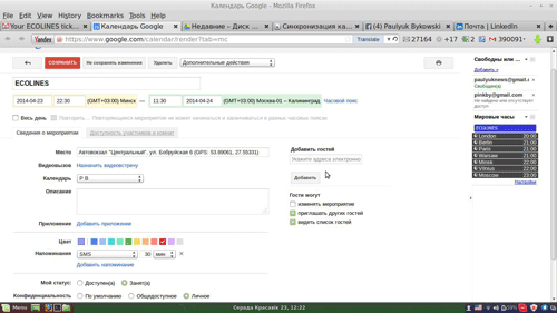Календарь Яндекс действует похожим образом. Недостаток – меньше людей в моем окружении пользуется почтой Яндекса, планирование возможно только в одном и том же часовом поясе. Среди плюсов – почта сама анализирует письма, и если там упоминаются события будущего (это характерно для пресс-релизов, приглашающих на те или иные мероприятия), Яндекс интересуется: а не напомнить мне об этом событии поближе к дате.