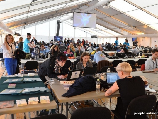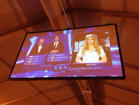 В рабочей зоне. Она напоминала плохо организованное уличное кафе под навесом. Деревянный пол, сбитый из досок, который иногда прогибался, а во время дождя было очень шумно и дуло из щелей палатки. Рабочих столов было много, места хватала всем. На каждом столе было по несколько розеток, также был проводной высоскоростной интернет. Но в основном все пользовались бесплатным wi-fi. Была отдельная точка доступа для прессы, потому что на всей территории Евровидения был еще и бесплатный интернет для всех посетителей. Пароли к интернету были наклеены на стенах палатки. В этой зоне висели четыре больших монитора, где журналисты следили за шоу. Звук был отдельный – колонки были установлены вдоль всего «шалаша». Были также бесплатные принтеры и ксероксы. На один ряд столов был один компьютер общего пользования с подключением к интернету.