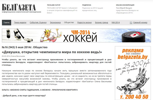 Информационно-аналитический еженедельник «Белгазета» активничал в эти дни. Появлялись материалы с арен как двух аккредитованных на чемпионат журналистов,  так и неаккредитованных корреспондентов. Из всех новостей про хоккейные матчи и репортажей из зон гостеприимства выделяются два материала. Как корреспондентка пыталась забронировать квартиру для гостей Минска. И материал, написанный сразу после появления слуха о том, что иностранное пиво исчезнет с прилавков на время ЧМ-2014.