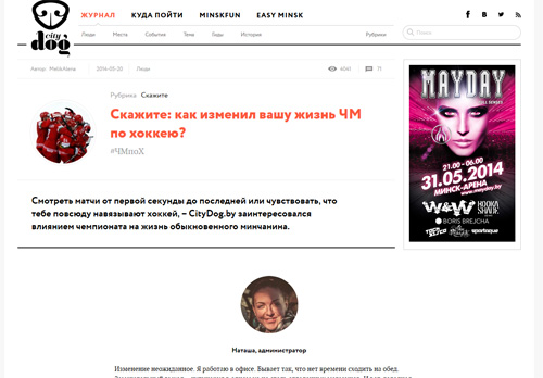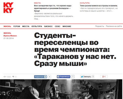 За пару дней до старта чемпионата KyKy.org выпустил обзор мобильных приложений о Минске с понятным описанием плюсов и минусов программ. Уже под конец турнира появился интересный материал про быт студентов, которых на время Чемпионата мира по хоккею переселили в другие общежития, чтобы хорошие места отдать внаем болельщикам. И уже в день финального матча вышло интервью с зубром Валерой, символом чемпионата в Минске.