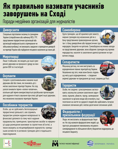 Эти интернет-мемы содержат элемент манипуляции, используя их, журналисты не называют вещи своими именами. Именно поэтому в СМИ они заняли маргинальную позицию. На первое место вышли банальные описательные определения, типа "вооруженные люди". Этого достаточно иностранным корреспондентам, но совсем недостаточно украинским.