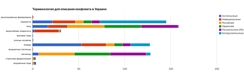 А вот в белорусских СМИ обнаружилось различие в использовании терминологии в зависимости от используемого языка (белорусского или русского), а не от формы собственности издания (здесь отличие было скорее в количестве публикаций и их эксклюзивности). В исследуемых русскоязычных СМИ более активно использовался термин ополченцы (38,2%), чуть менее активно - террористы (24,7%).