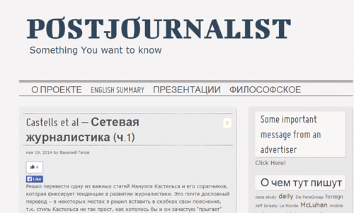 Медиа-аналитик Василий Гатов перевел важную статью известного американского социолога Мануэля Кастельса, посвященную развитию сетевой журналистики. Кастельса и его коллеги констатируют бессмысленность «профессионального информирования» и как бизнеса, и как «журналистской» деятельности. В качестве основных функций журналистики авторы выделяют и рассматривают четыре: функцию информационного фильтра, способность доставить потребителю контекст события, анализ информации и способность делать из нее выводы, а также способность организовывать «пространство диалога», обеспечивать общество поводами для дискуссии.