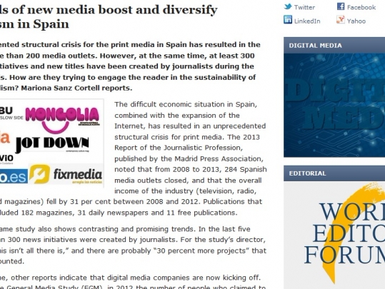 Сложная экономическая ситуация и распространение интернета привели к том, что в период между 2008-2013 в Испании закрылись более 200 традиционных изданий и теле-редакций и более 11 тысяч журналистов остались без работы. Примерно в этот же период появились примерно три сотни совершенно новых медиа. Кто их создал, как они пытаются привлечь читателя, чем зарабатывают на жизнь и на что рассчитывают – в репортаже на сайте "Ассоциации газет и новых издателей".