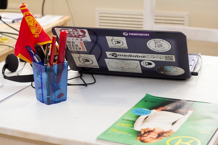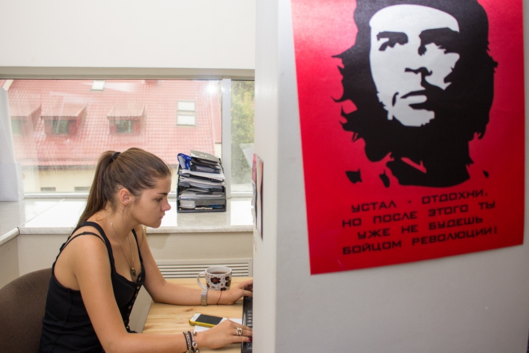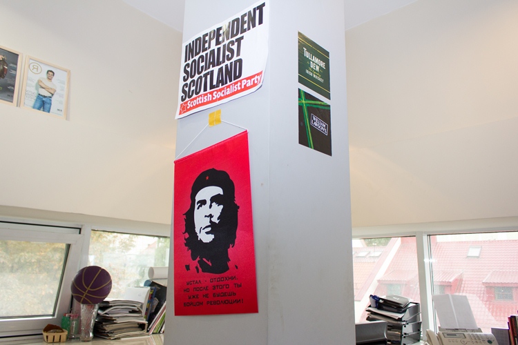 Над портретом Эрнесто Че Гевары висит плакат социалистической партии Шотландии, которая скоро будет учреждать референдум о независимости. «Мы решили вступить в переписку, чтобы спросить, как проходят идеи сепаратизма в Евросоюзе. А они нам в ответ прислали кучу своего промо-материала» - рассказывает Андрей Диченко.