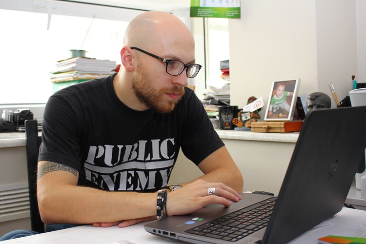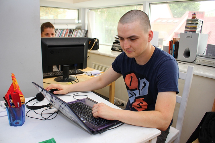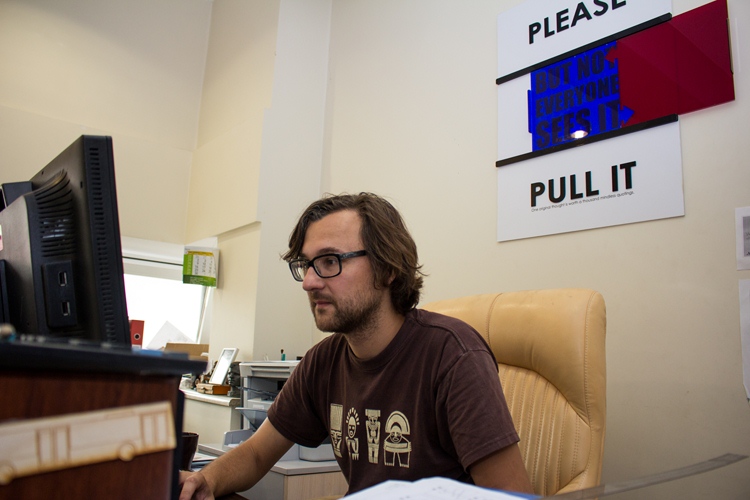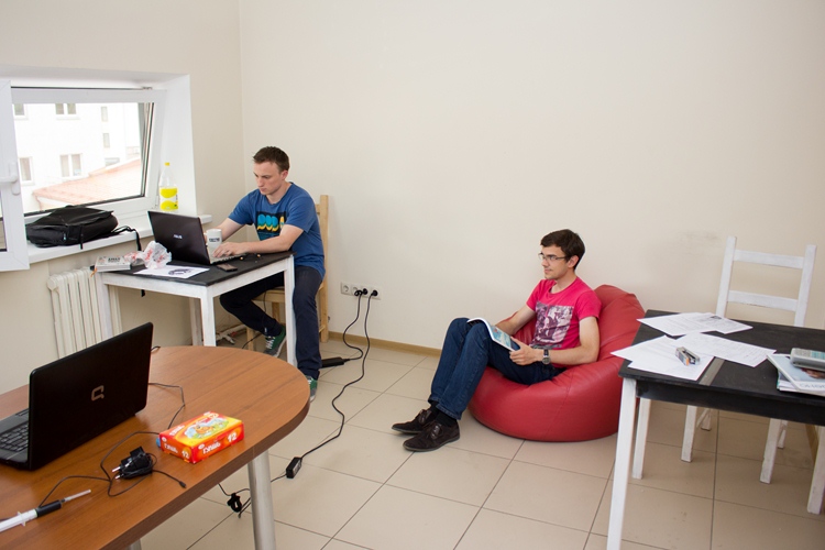 В кабинете неподалеку находится творческая лаборатория. Там, во время съемки, сидели два Александра, оба веб-дизайнеры.