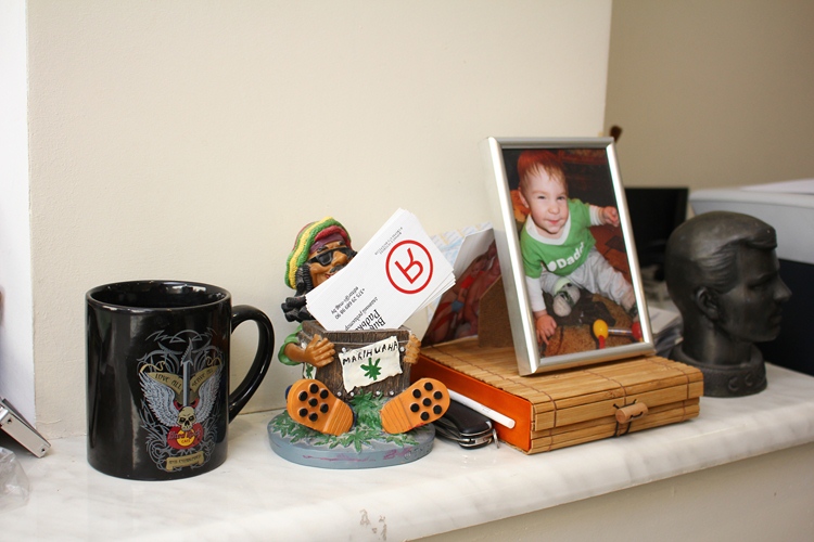 Слева от Радькова стоят кружка из Hard Rock Cafe, хранилище визиток и бюст Гагарина