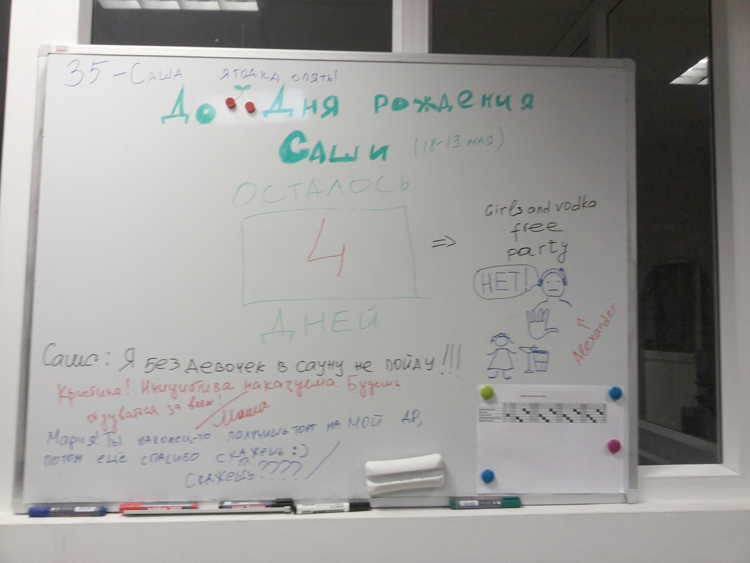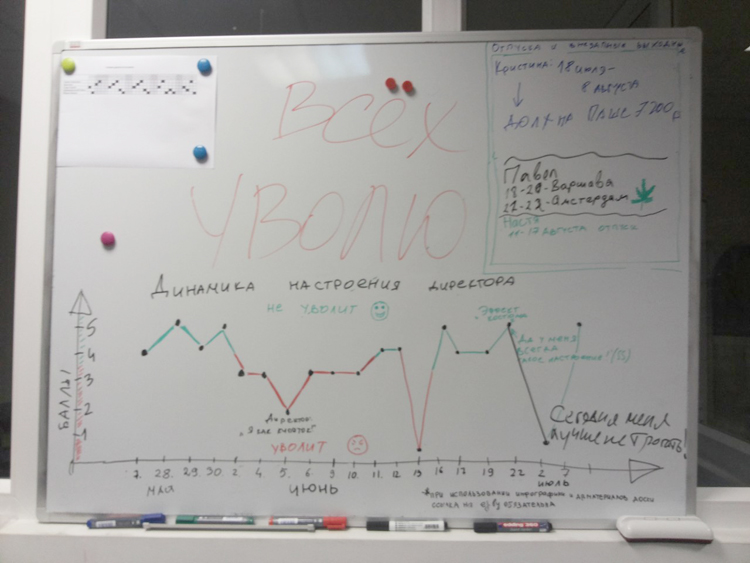 Справа на перегородке стоит магнитно-маркерная доска. Так как мы пришли в гости в понедельник, оная была еще чистая. Но к концу недели будет исписана. «Иногда сотрудники на ней чертят графики настроения директора, иногда какие-то объявления. Я здесь ставил плюсы и минусы по работе сотрудников, чтобы знать, кого премировать, а кого депремировать» - говорит Сергей Сацук. Кристина Сухаревич поделилась с Mediakritika.by фотографиями, как доска может выглядеть к концу недели: