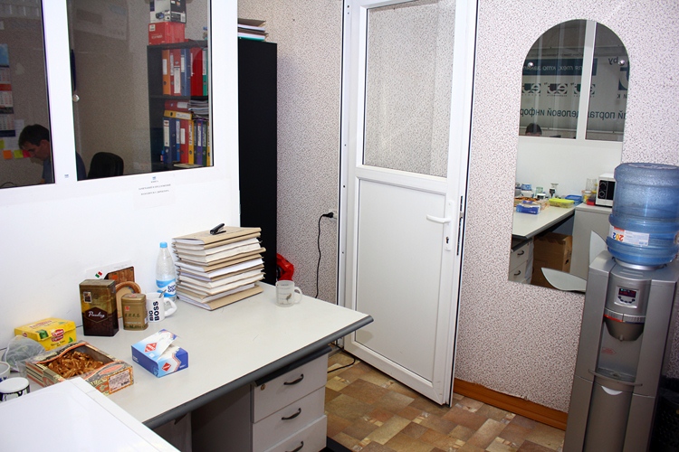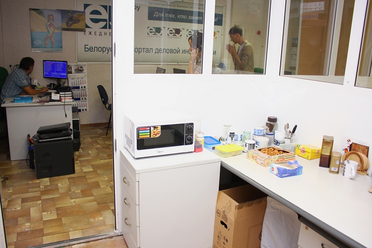 Двери в «Ежедневник» находятся на первом этаже. Сразу за ними взгляду посетителя — импровизированная кухня. «Микроволновку девочки подарили мужчинам на 23 февраля. А теперь все вместе пользуемся. Видите, какие у нас девушки практичные!» - рассказывает главред.
