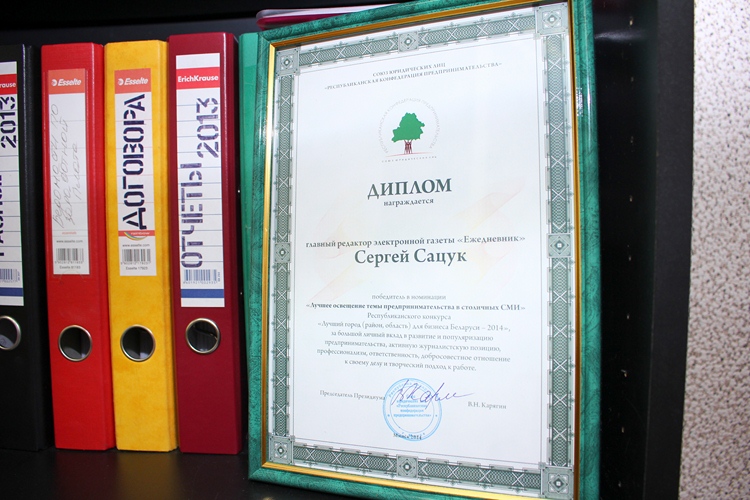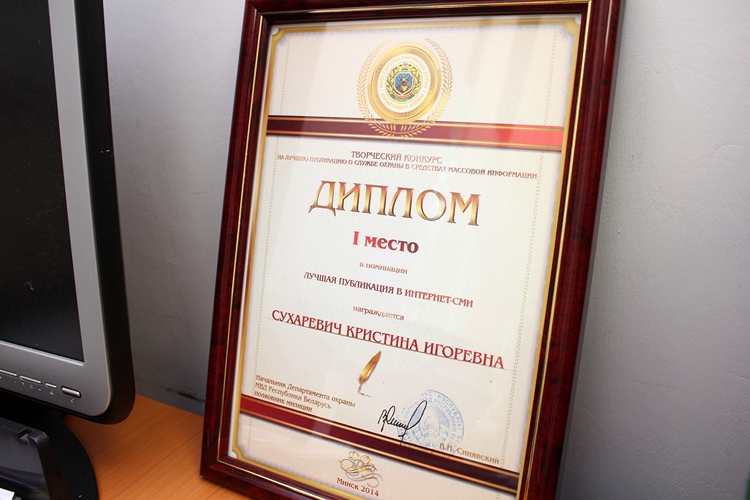 По правую руку от Кристины Сухаревич стоит диплом от Департамента охраны МВД РБ. В этом году девушка заняла первое место в номинации «Лучшая публикация в интернет-СМИ».