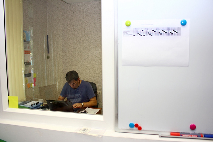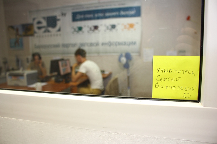 Там же еще две двери: слева помещение, где работают журналисты, а справа — кабинет Сергея Сацука и начальника рекламного отдела, который на момент визита Mediakritika.by находился в отпуске. Помещение построено по принципу максимальной открытости: все внутренние перегородки в половину высоты прозрачные.