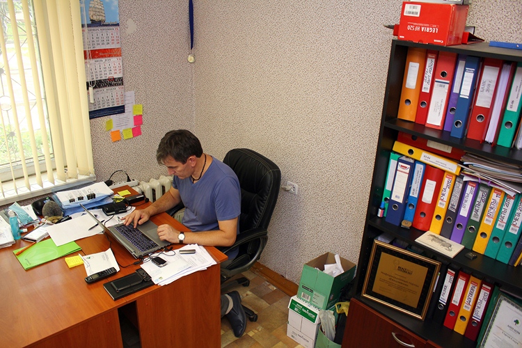 Кабинет у директора и начальника рекламного отдела небольшой. Рабочий стол, шкаф с рабочей документацией и журнальный стол — пожалуй, на этом все.