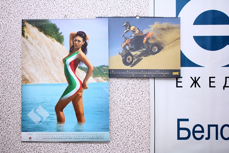 Над ним висят два календаря. Один — очень интересный, подарен во время пресс-конференции.