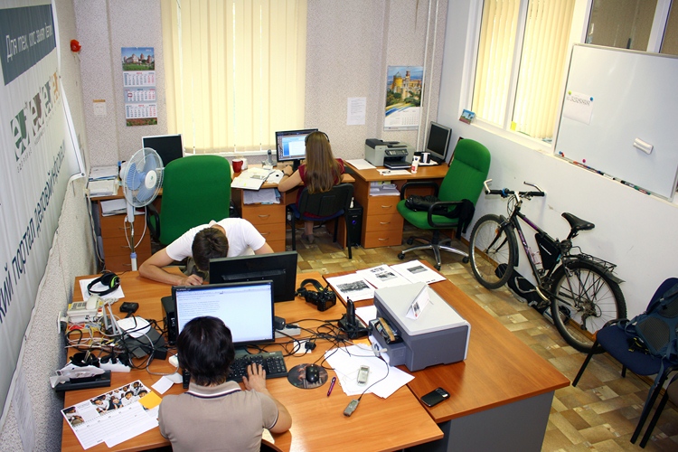 Входим в рабочий кабинет журналистов. Здесь могут одновременно работать 7 человек. На полстены фирменная растяжка проекта. Когда «Ежедневник» является партнером какого-либо мероприятия этот баннер снимают со стены и везут на место проведения события.