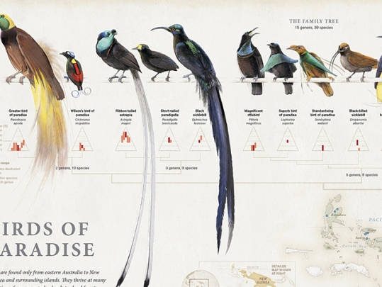 Фрагмент инфографики National Geographic, посвященной райским птицам, обитающим в Папуа-Новой Гвинея и Австралии.