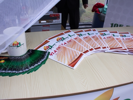 Около палатки «Белпочты» поставили несколько пластмассовых столов и стульев. А вместо чая-кофе на столах лежат газеты «Мінская праўда» и памятки для клиентов. Внутри палатки несколько стендов, один из которых полностью отдан на откуп периодическим изданиям.