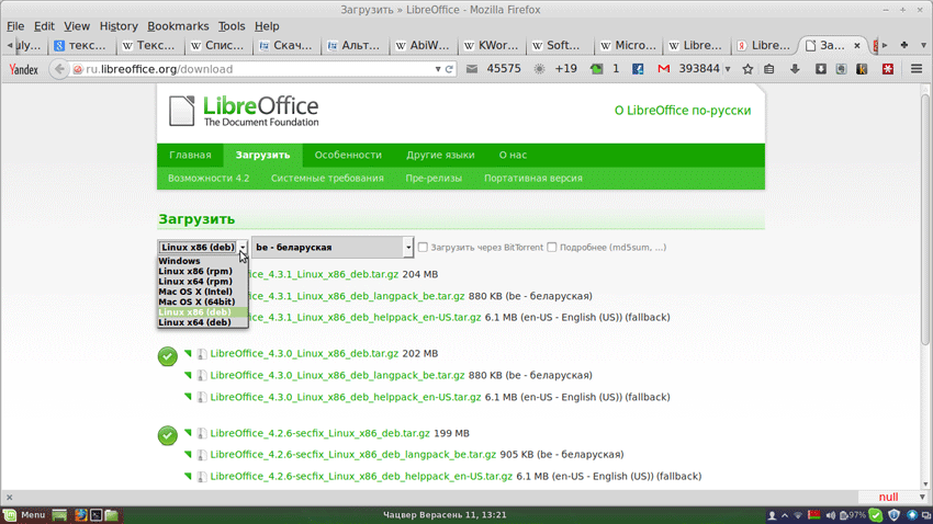 LibreOffice предлагает тот же набор офисных программ, что и OpenOffice, с почти тем же интерфейсом. В 2014 году вышла новейшая версия LibreOffice 4.3. Как и OpenOffice, LibreOffice имеет белорусскую локализацию. Для проверки орфографии нужно установить словари (официальный ("наркомаўка") и классический ("тарашкевіца"). Словари поставляются и устанавливаются как расширения по следующему алгоритму: Сервис -- Язык -- Дополнительные словари в режиме онлайн для открытия страницы словарей в веб-обозревателе по умолчанию. Можно использовать также LanguageTool.