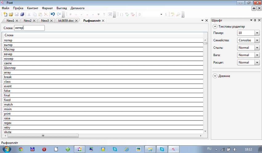 Poet - текстовый редактор с белорусским интерфейсом. Редактор разработан минчанином Владимиром Макаревичем. Как сообщает автор, в этом редакторе вы сможете писать стихи, редактировать код, осуществлять поиск нужной информации, исследовать документы. Для написания стихов тут есть специальная функция - рифмоплёт, в которой программа ищет рифму к любому слову. Poet имеет проверку орфографии для русского и английского языков. Редактор не умеет открывать документы в формате ".doc" и общим для внешнего мира форматом тут будет только ".txt".