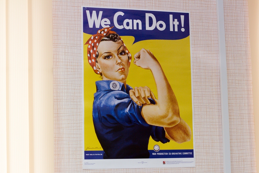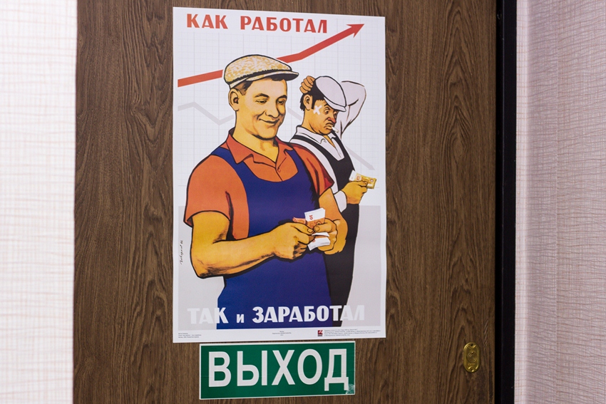 За спиной у Алеся входная дверь в офис, на внутренней стороне которой висит мотивирующий плакат. Репродукция плаката художника Виктора Говоркова от 1964 года.