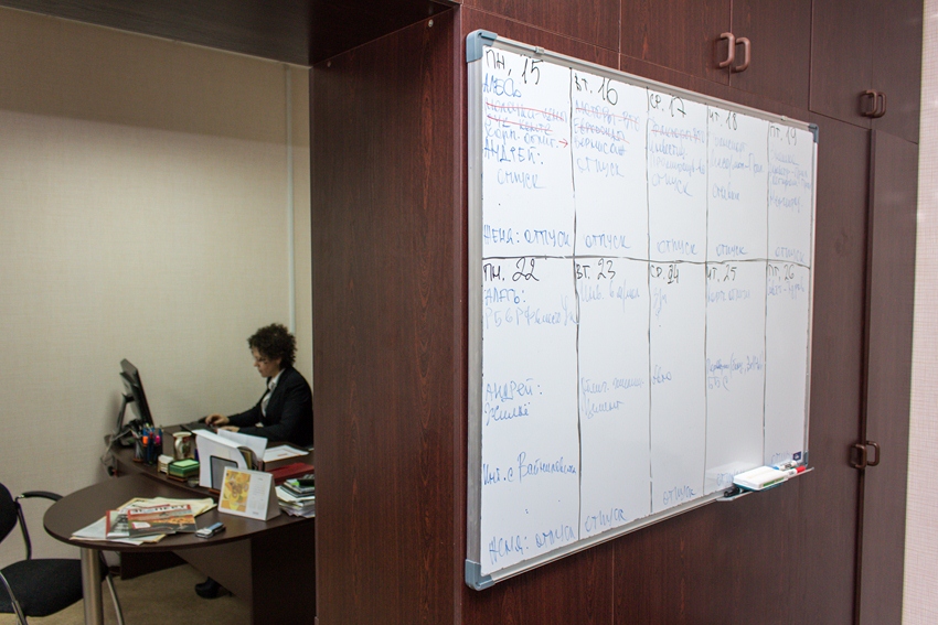 «Перед фотосъемкой мы, конечно, немного тут прибрали и оставили белых пятен. Но мы планируемся на две недели вперед. Такая доска позволяет лучше распределять задачи и расставлять приоритеты, потому что у нас, помимо ежедневных задач, очень много проектов, значительно растянутых во времени. Это обзоры рынков и исследования, работа над которыми идет больше месяца. Все это нужно держать во внимании. Клиенты у нас представляют разные сферы экономики, а такое планирование позволяет ни о чем и ни о ком не забыть», - делится Ирина.