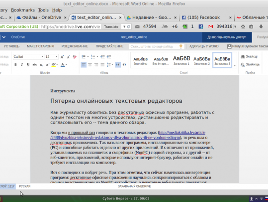 Office Online - бесплатная облачная версия Microsoft Office. Возможен выбор белорусскоязычного интерфейса, но проверка белорусского языка отсутствует. Для начала работы нужна регистрация. Можно использовать аккаунт Microsoft или той почты, которой вы пользуетесь. Главное достоинство - тесная интеграция с Office 365 и сервисами Microsoft.