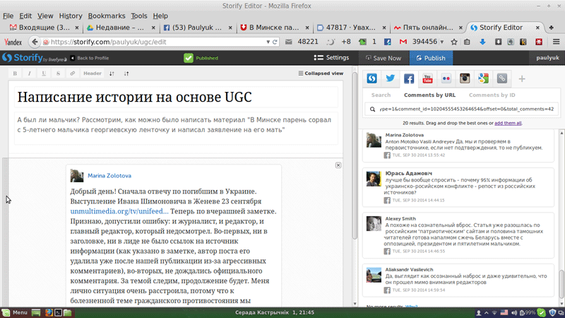 Но лучше, если речь идет об открытых записях соцсетей, указывать ссылку. Более того, есть замечательный сервис Storify, с помощью которого можно публиковать у себя на сайте оригиналы постов и комментариев в соцсетях, блогах, Твиттере.