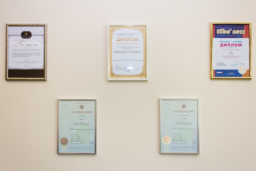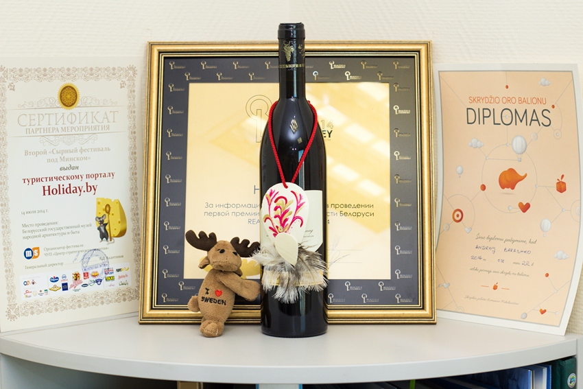 На полке за спиной редактора расположились сертификат участника «Сырного фестиваля», награда от Realt Golden Key за информационную поддержку, а также диплом, выданный директору проекта Андрею Барашко в Вильнюсе за то, что он полетал на воздушном шаре.