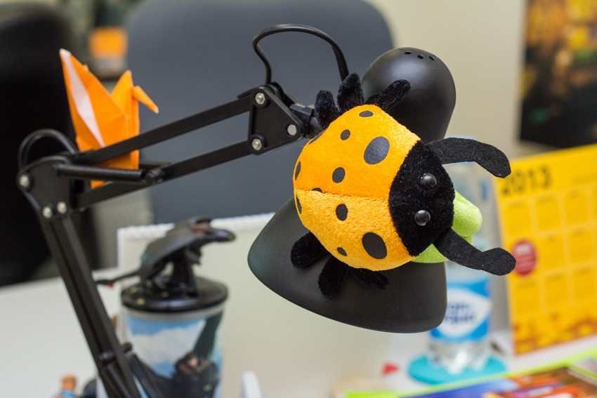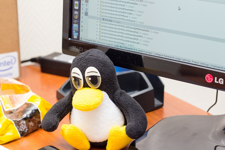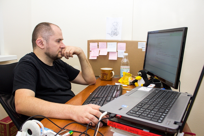Около монитора программиста сидит пингвиненок, талисман Linux. «Есть такая классная методика: когда тебе нужно с кем-то посоветоваться, ты можешь поговорить с воображаемым другом. А у меня есть пингвиненок!» — делится своим прочтением известной методики Роман.