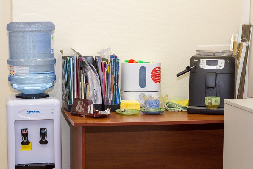 Чайно-кофейная зона этого офиса находится по левую руку от двери. «Мы часто куда-то ездим и когда возвращаемся привозим из поездок какие-то вкусности — шоколад, печеньки и так далее, и обязательно угощаем коллег», — делится Ася Поплавская.