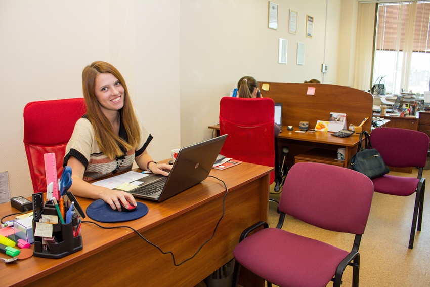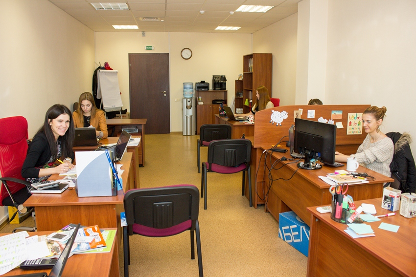 Переходим в соседнее помещение. Здесь располагаются все менеджеры проекта Holiday.by: Дарина Демьянкова — специалист по работе с агроусадьбами, клиентами проекта «Отдых в Беларуси»; Елена Куровская — специалист по работе с турфирмами; Мария Стахейко — аккаунт-менеджер Holiday.by; Ольга Короткова — офис-менеджер; Екатерина Щеглик — специалист по работе с турфирмами; Мария Комар — тимлид отдела продаж и Юлия Луцив — специалист по работе с клиентами проекта «Аренда зала».