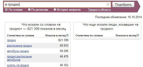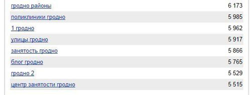 Данный сервис показывает “Что искали пользователи со словом “в гродно” за месяц”. Наиболее популярные фразы “расписание гродно”, “автобусы гродно” и другие частотность, которых более 10 000 можно отнести к высокочастотным запросам. Поднять сайт в топ поисковых систем по таким запросам достаточно сложно и без помощи профессиональных SEO-оптимизаторов скорее всего не получится. Но существует огромное множество среднечастотных и низкочастотных запросов, на которых можно сконцентировать внимание. Например: