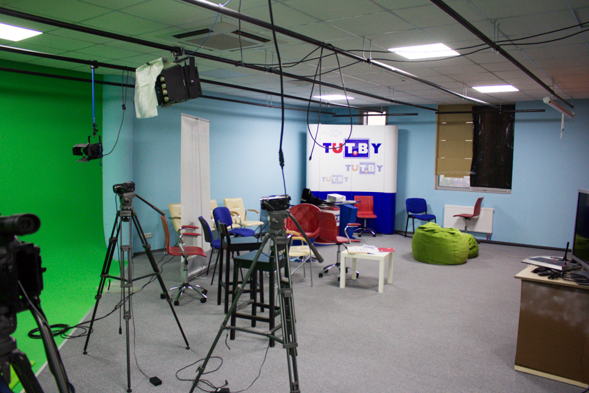 На том же, центральном 9 этаже, сразу за стеной основной редакции находится видеостудия портала TUT.BY. В этом помещении фактически три съемочные зоны. Здесь, к слову, хранятся бронежилеты, в которых журналисты медиа ездят в Украину.