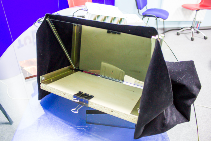 Алена Шеремет (Андреева) показывает не совсем понятную с первого взгляда конструкцию. И далее рассказывает, что они изобрели себе суфлер, который используется в проекте «Баяны недели» — сюда подкладывают планшет с текстом.