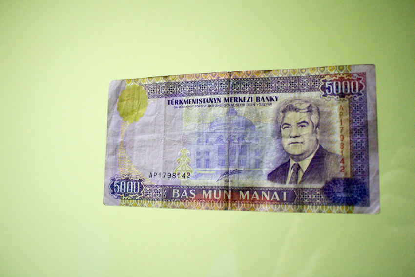Пятитысячная туркменская купюра приклеена к прозрачной стеклянной двери, чтобы люди замечали перегородку и не ударялись головой, когда идут.