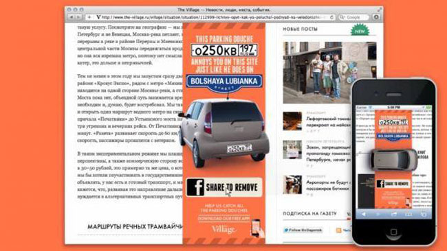 «Проект городского сайта The Village. Был очень актуальным в Москве, пока там не сделали платные парковки. Суть такая: если ты видишь, что стоит машина, которая припаркована неправильно, ты идешь и фотографируешь номер, указываешь марку машины и отправляешь фото в мобильное приложение. Когда кто-то в этом районе, который вы отметили, заходит The Village, то у читателя на всю страницу, на весь экран появляется гигантское изображение авто. И надпись: «Автомобиль на сайте мешает чтению так же, как на улице — проходу пешеходов». И призыв поделиться координатами этого чудака в соцсетях. Банер этот был очень назойливым, люди расшаривали изображение автомобилей, которые рано или поздно узнавали знакомые, коллеги и соседи того, кто неправильно припарковался. Этот проект взял приз на Каннских львах, кстати».
