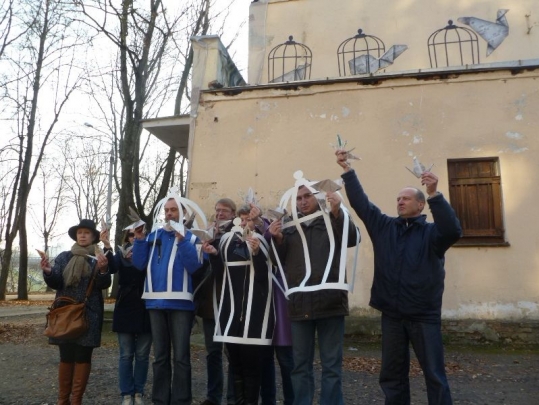 Некалькі чалавек вырашылі развіць ідэю невядомага графітыста. Выразалі клеткі з паперы, зрабілі з газеты птушак-арыгамі, узялі іх у рукі…Дарослыя, здавалася б, людзі. Але нам было весела і цікава. Мы таксама адчувалі сябе творцамі. І фатаграфаваліся.