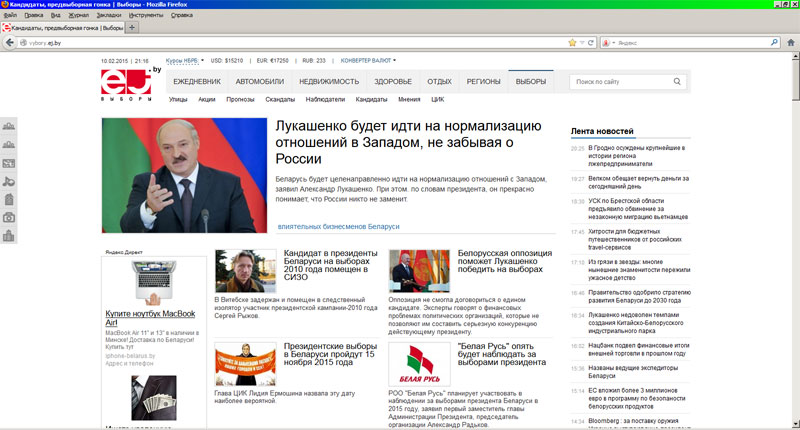 Проект известного белорусского интернет-издания «Ежедневник». По принципу формирования похож на предыдущий ресурс, но отличий много. Во-первых, довольно скромное количество заметок, связанных с выборами. Политика – явно не «конек» «Ежедневника». Во-вторых, если пролистать этот раздел вниз, то выясняется, что он посвящен выборам не только президента и не только в Беларуси. Причем, несмотря на достаточно четкое структурирование, сам раздел выглядит каким-то «непричесанным» и не слишком удобным в использовании. Словом, есть куда развиваться.