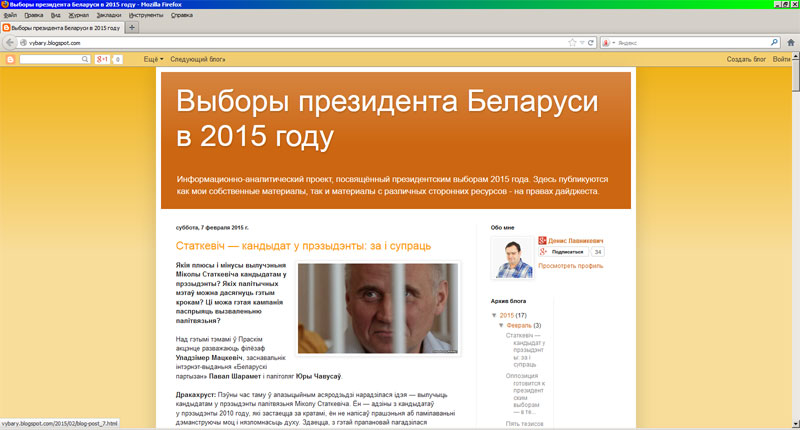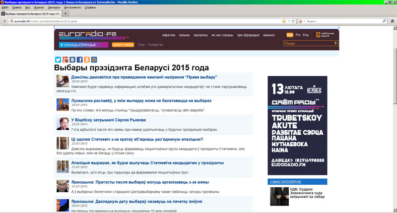 Это проект «Еврорадио», очень, на мой взгляд, удачный. Развивается с 6 мая 2014 года. Новые заметки и новости, так или иначе посвященные теме грядущих выборов, появляются постоянно. Если нужно узнать, что в рамках подготовки к выборам делает оппозиция – место очень удачное. А вот информации про действия властей – намного меньше.