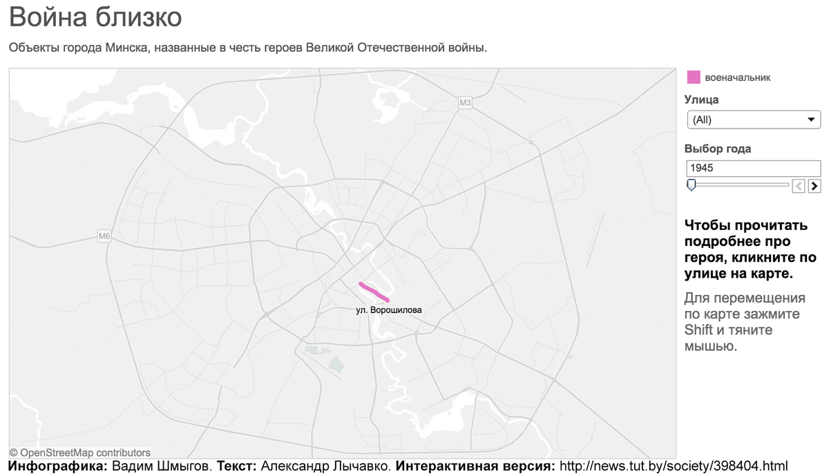 Тот факт, что День Победы стал праздником и нерабочим днем только в 1965-м, а особо активно увековечивать героев войны начали после 1975 года в честь 30-летия Победы, хорошо виден в инфографике по улицам Минска, названным в честь ВОВ и ее героев. Также видно, как после распада СССР и до референдума 1996-го не было переименований или новых названий улиц, связанных с войной.
