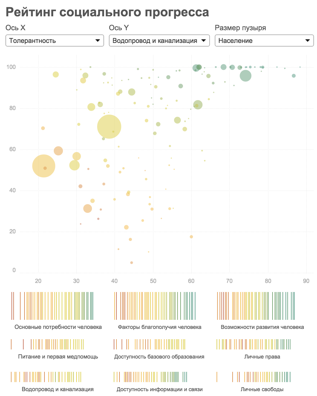 Например, в замечательном рейтинге стран от MIT можно, кроме просмотра данных о странах, провести свой анализ, например, проследить зависимость толерантности от доступности водопровода и канализации и численности населения.