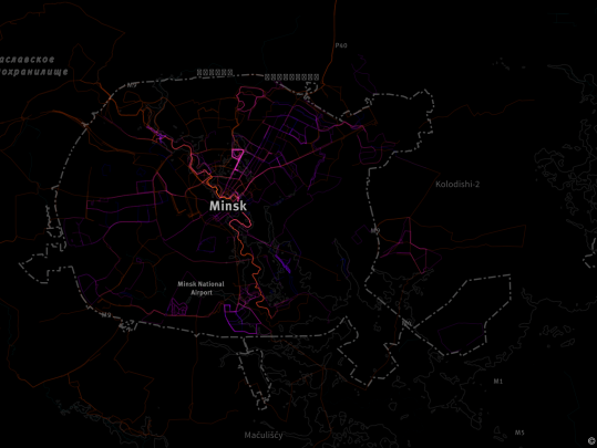 Например, по трекам пользователей приложения RunKeeper мы можем видеть самые популярные маршруты пробежек и велопрогулок минчан.