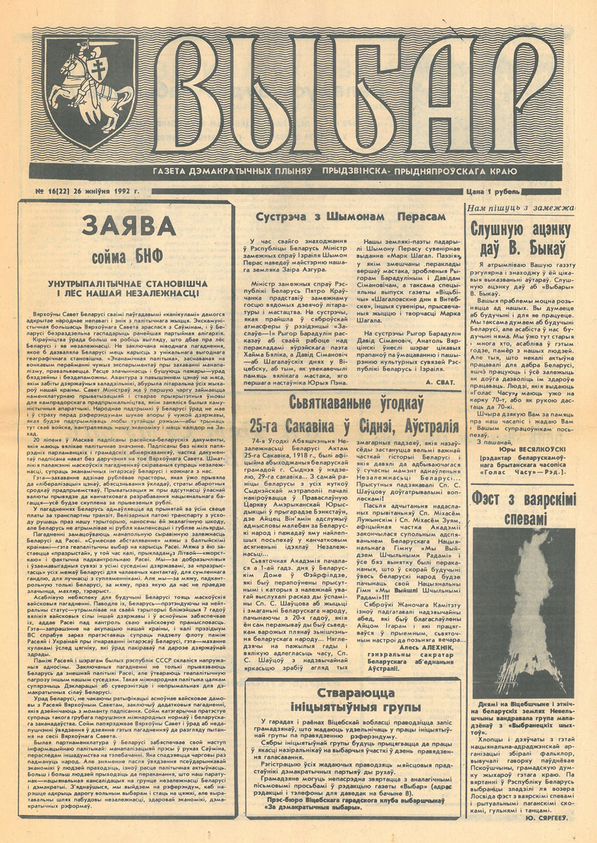 Сваю мэту рэдакцыя газэты ў яе першым нумары ад 2 кастрычніка 1991 году фармулявала наступным чынам: “Будзем дапамагаць новым і перагледзеўшым свае мінулыя пазыцыі старым грамадзкім сілам выцягваць Беларусь з 73-гадовай пустыні, падняць з каленяў змучаны і чакаючы чарговых сацыяльна-эканамічных крызісаў народ для пабудовы сапраўднага дзяржаўнага грамадзтва, сапраўднай дэмакратычнай і прававой дзяржавы”. Зазначу, што газета была адкрытая для самых розных палітычных плыняў дэмакратычнага накірунку.