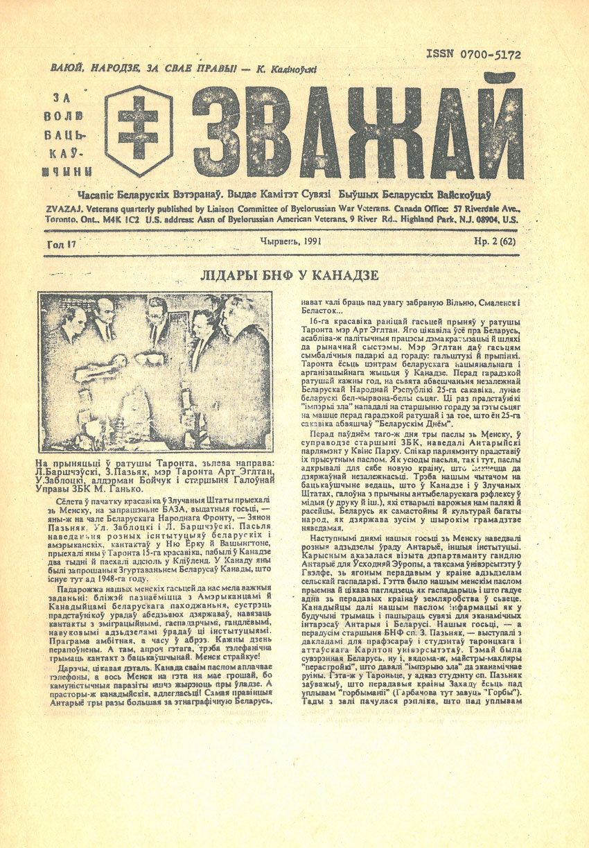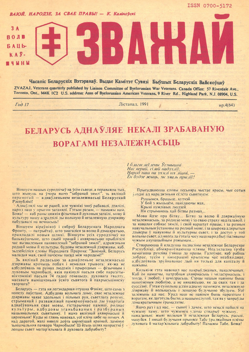 І вось – газета “Зважай”, два асобнікі каторай захаваліся ў маёй калекцыі. Можна было б падумаць, што гэта – нейкае выданне Беларускага згуртавання вайскоўцаў. Але ж не. Выданне «Зважай», якое сабе пазіцыяніравала як беларускі штоквартальны часопіс, было заснавана ў 1974 годзе ў Таронта Аб'яднаньнем Беларускіх Вэтэранаў. Газета выдавалася да 1998 года, ад імя “Камітэта сувязі быўшых беларускіх вайскоўцаў”, як напісана на першай старонцы.